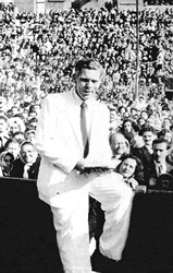 Reiður múgur réðst að þeim með sverðum og með byssum. Og eins og Jesús, þá gengu þau í gegnum mannfjöldann og fólkið gat ekki fundið þau, en þau fóru fram í nafni Drottins, og alls staðar þar sem þau réttu þau fram hendur sínar, þá læknuðust sjúkir - blind augu opnuðust. Það voru ekki langar bænir, og eftir að ég hafði margsinnis farið yfir sýnina í huganum og ég hafði oftsinnis hugsað um hana, þá áttaði ég mig á því að ég sá aldrei neina kirkju og ég sá aldrei eða heyrði um neina kirkjudeild, en þetta fólk fór fram í nafni Drottins Hersveitanna. Halleljúja!